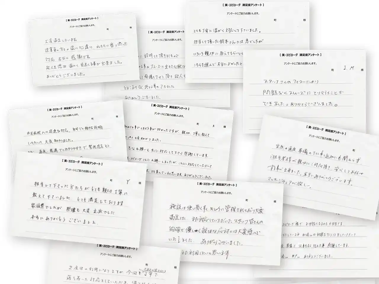 美・エピローグで実際にご依頼いただいたご遺族様から、たくさんの温かいメッセージをいただいています。 「お願いしてよかった」「安心して任せられた」──そんな声が私たちの原動力です。 ぜひ、実際のお声をご覧ください。