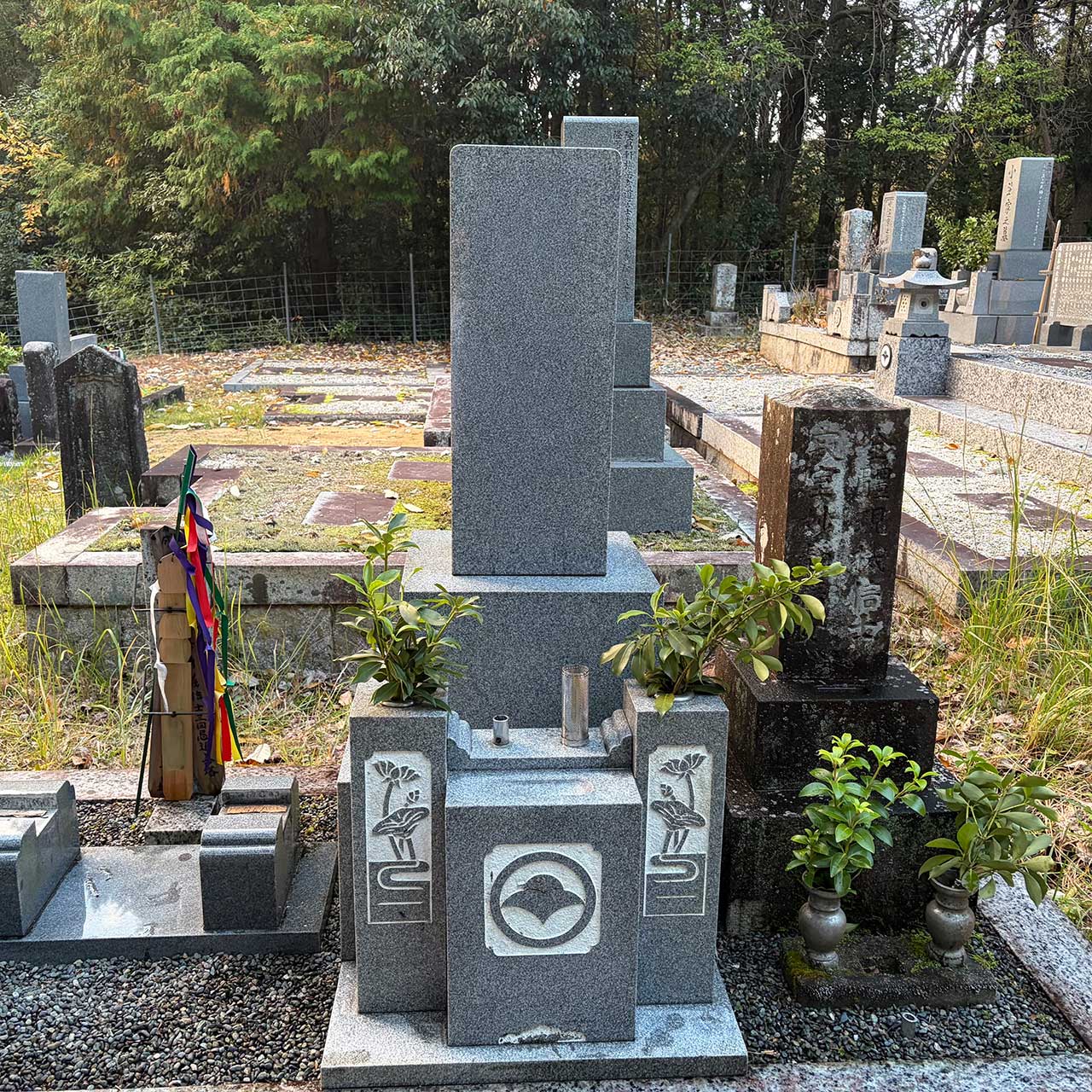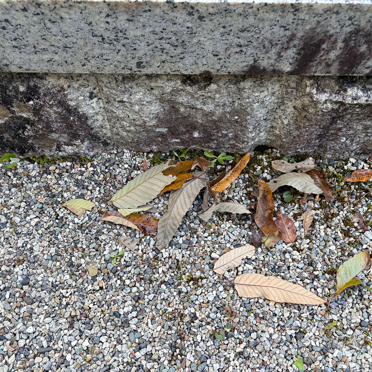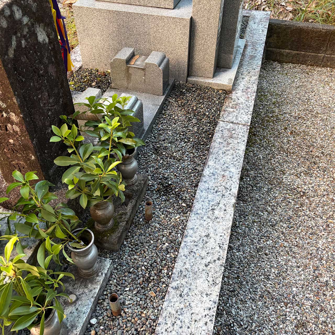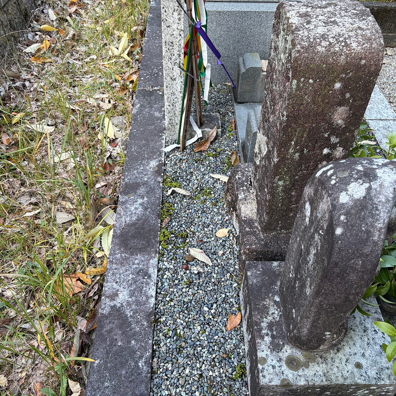 山あいの静かな霊園にて、通路や区画に積もった落ち葉を中心に丁寧に清掃し、周囲の小さなゴミも取り除きました。